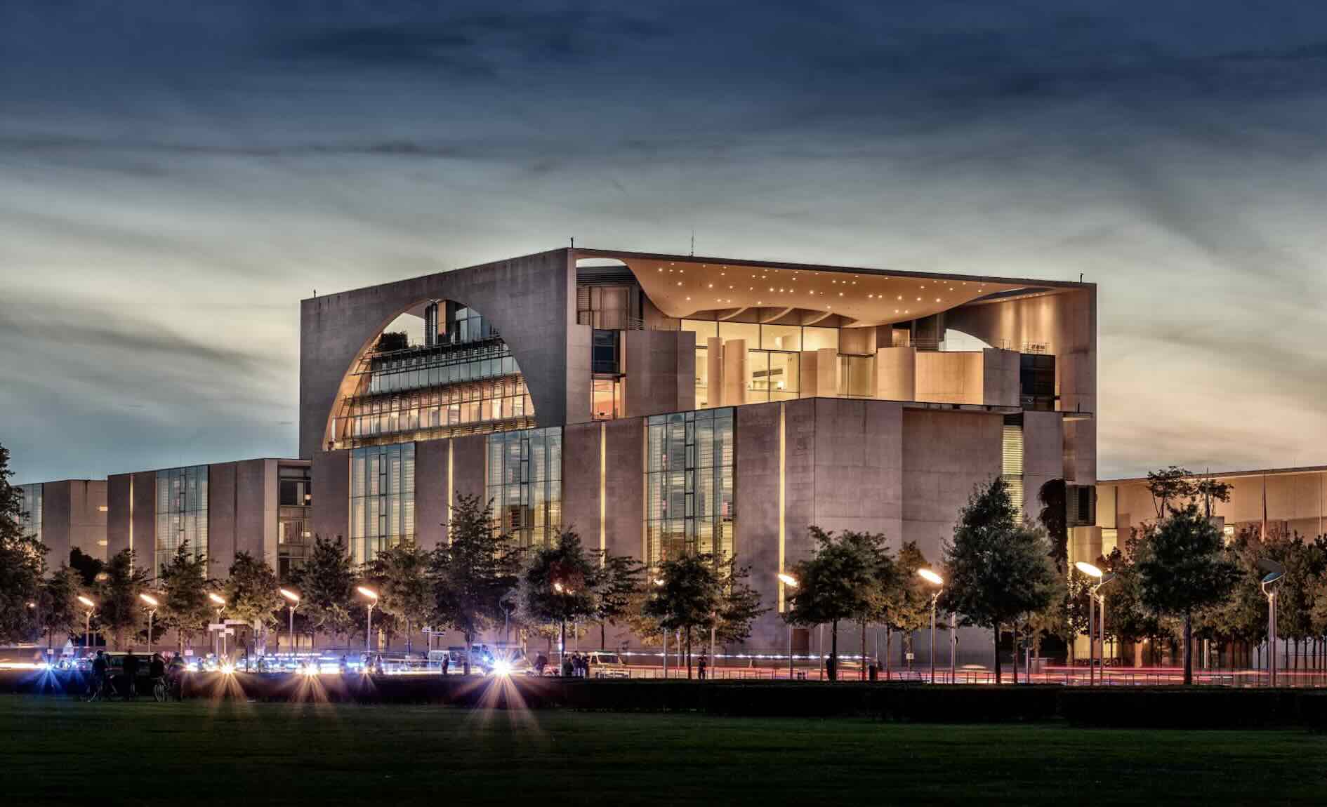 Bundeskanzleramt / Kanzleramt / Friedrich Merz / Quelle: Unsplash, lizenzfreie Bilder: LoboStudio Hamburg:https://unsplash.com/de/fotos/beleuchtetes-betongebaude-unter-grauem-himmel-GmhL-vCXnL0