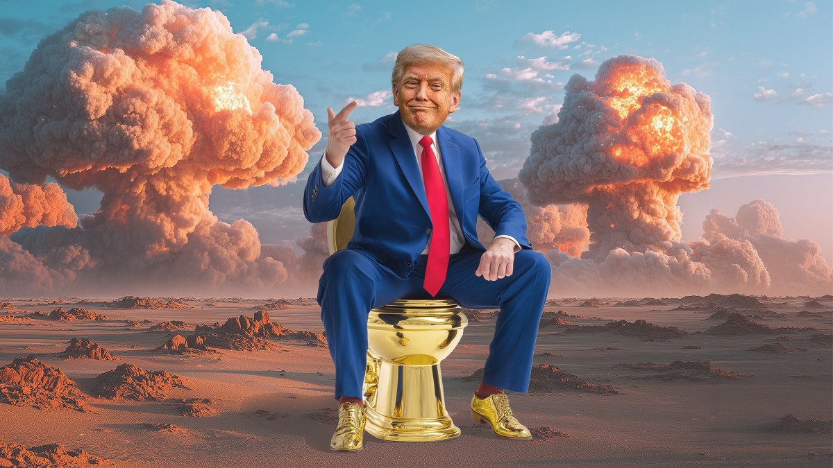 Wäre nicht alles auf eine so furchtbare Weise real, Donald Trump gäbe die ideale Figur für einen Comic-Strip ab. Erstes Bild: Donald will etwas haben und droht denen, denen es gehört, mit brutaler Gewalt. Zweites Bild: Donald macht etwas Bösartiges, Widersinniges und Planloses. Drittes Bild: Vor Trümmern, Mauern und Explosionen sitzt Donald auf einem goldenen Klo, wischt sich den Hintern mit dem Völkerrecht und lässt sich von seinen Vasallen für seinen großartigen Deal mit irgendwas Goldenem feiern.