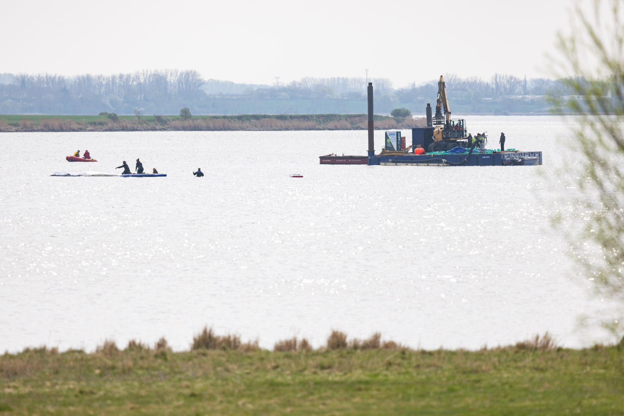 Sechs Personen sind langsam zum Wal vorgedrungen, das Wasser ist dort rund 1,40 Meter tief. Mindestens ein oder zwei davon sind Taucher. Ziel ist, später eine Plane unter den Wal zu legen. Möglicherweise muss dazu vorher noch Schlick weggespült werden, dafür wird nun die Lage sondiert.