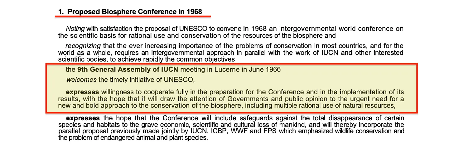 Und die IUCN – die Internationale Union für Naturschutz – verpflichtete sich bereits zwei Jahre vor der Biosphärenkonferenz auf ihrer Generalversammlung 1966 zur Teilnahme und versprach, „bei der Vorbereitung der Konferenz und der Umsetzung ihrer Ergebnisse uneingeschränkt mitzuwirken“.