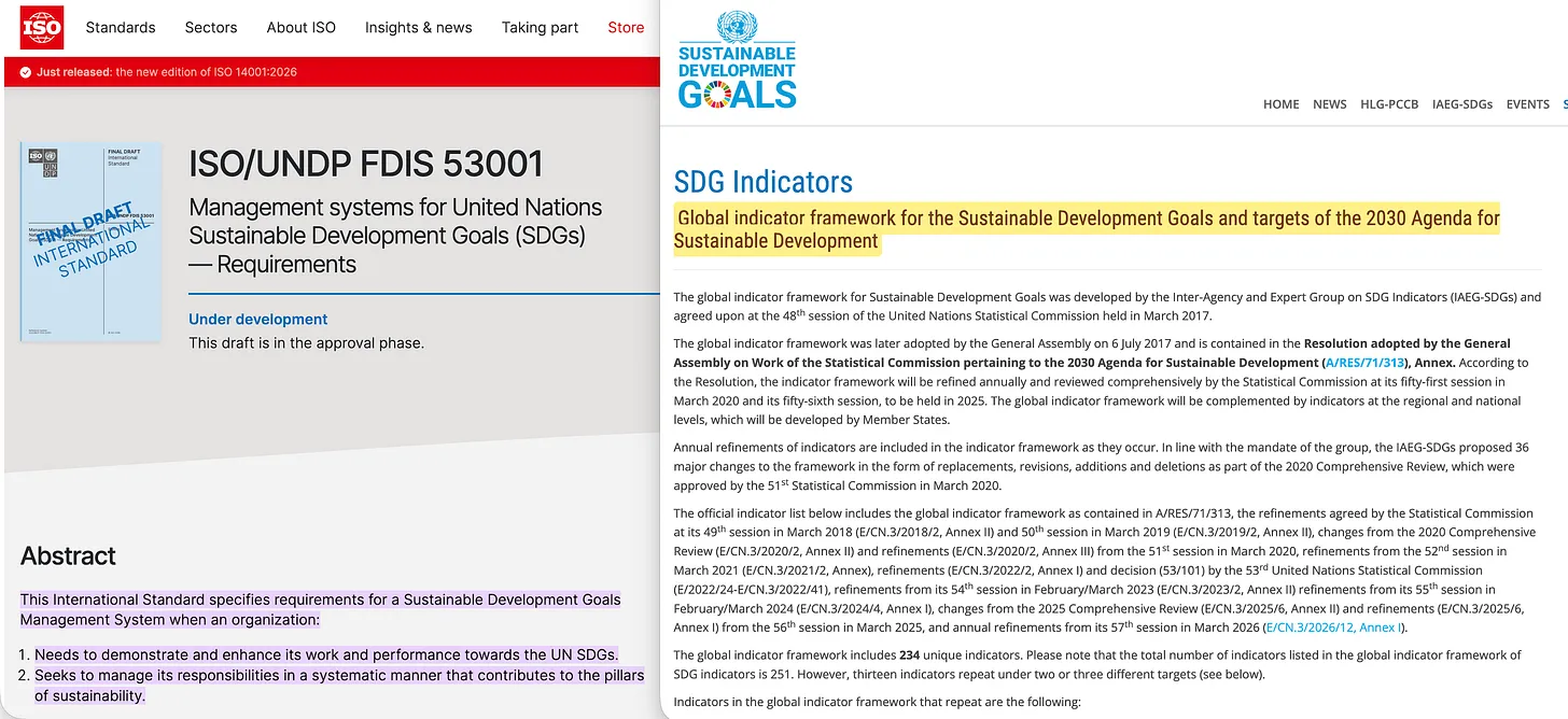 Die SDGs 1 bis 15 sind fünfzehn unumstößliche ethische Forderungen – keine Armut, kein Hunger, gute Gesundheit, sauberes Wasser, Klimaschutz und so weiter. Jedes davon erzeugt seinen eigenen Standardisierungs-Mess-Korrektur-Kreislauf: standardisierte Metriken, Messinfrastruktur und an die Leistung geknüpfte finanzielle Auflagen.