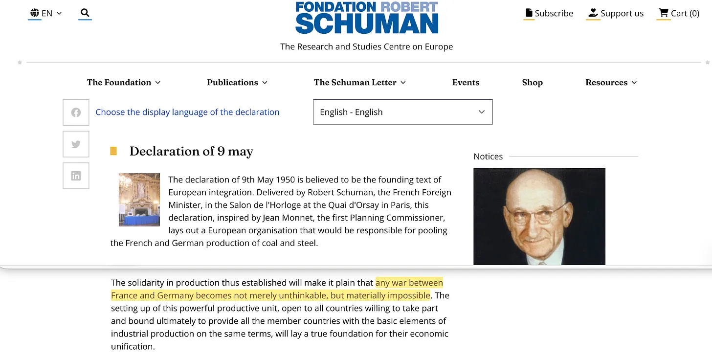 Bei der EGKS ging es nicht in erster Linie um Kohle und Stahl. Robert Schuman und Jean Monnet sagten dies ausdrücklich: Die Zusammenlegung der Produktion würde einen Krieg zwischen Frankreich und Deutschland „nicht nur undenkbar, sondern materiell unmöglich“ machen. Stahl war das Mittel, die supranationale Integration das Ziel.