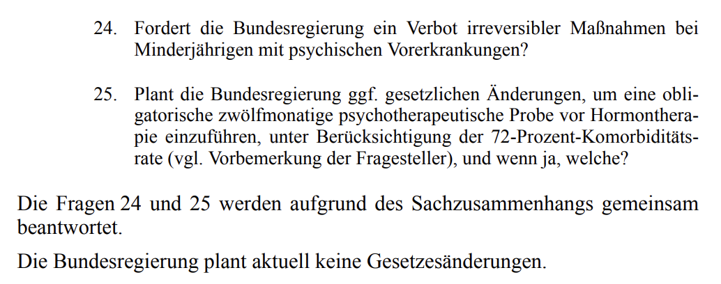 In einer Kleinen Anfrage an die Bundesregierung wies die AfD darauf hin, dass in Deutschland die Zahl der Diagnosen zu Störungen der Geschlechtsidentität bei Jugendlichen und jungen Erwachsenen im Alter von 15 bis 24 Jahren von 2013 bis 2022 um das Achtfache (auf mehr als 24 600 Fälle) gestiegen sei. 72,4 Prozent der Betroffenen wiesen dabei mindestens eine weitere psychiatrische Diagnose auf.
