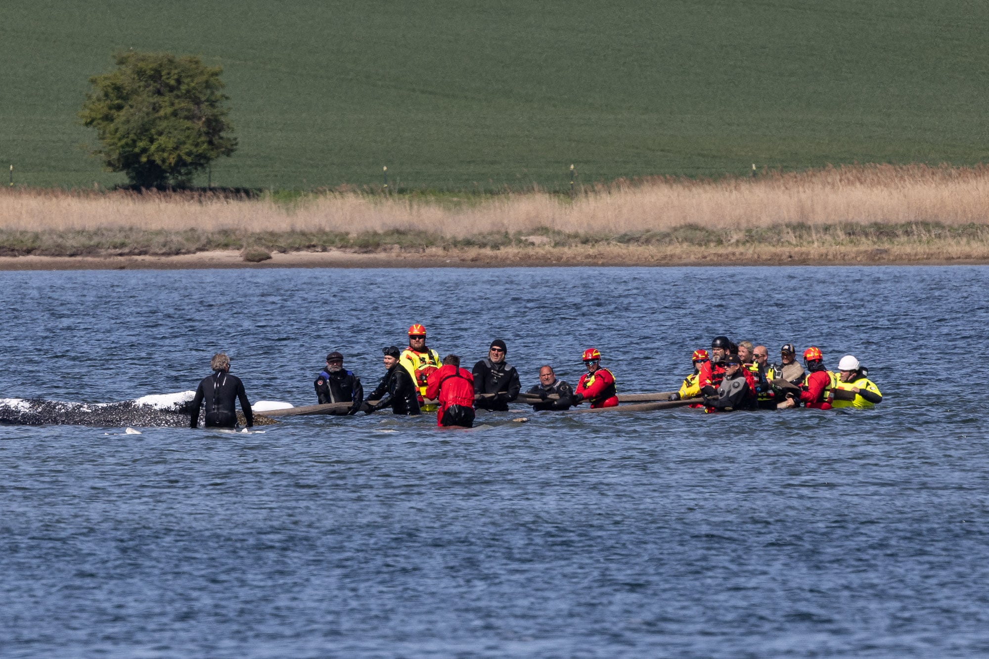Viele Helfer bemühen sich nun auf beiden Seiten des Buckelwals im Wasser, den Wal zu bewegen – mithilfe der Gurte bzw. Feuerwehrschläuche. Zunächst wurde einer der Gurte um die Brustflosse gelegt.